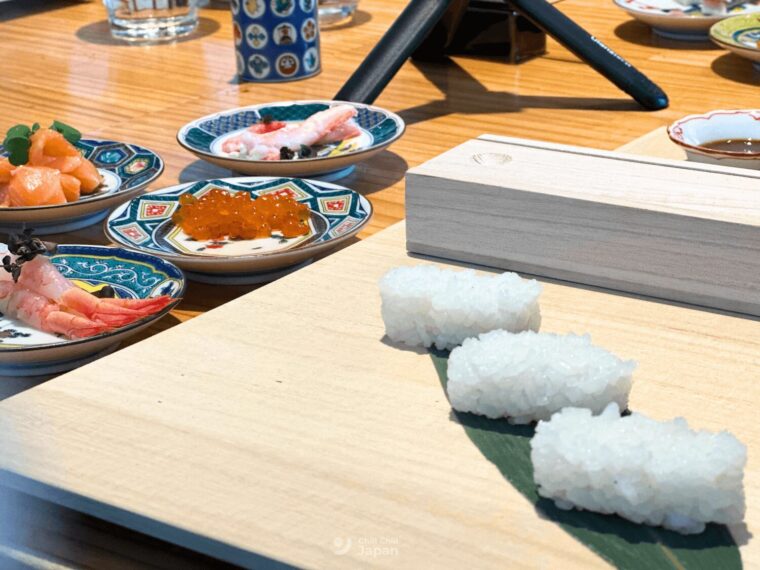 ใครจะตัดหน้าซูชิที่ได้มากินแจมไปกับข้าวและเทมปุระก่อนก็ได้ แต่อย่ากินเพลินจนไม่มีเอาไปทำซูชินะ