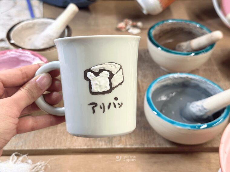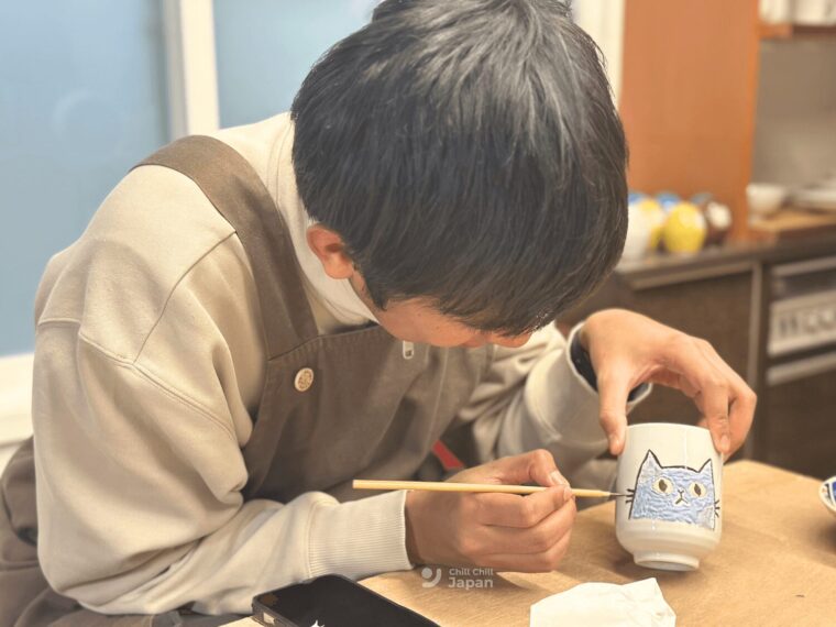 รอบนี้เราได้ลองทำเวิร์กช็อปแปะลวดลายทองลงบนถ้วยชาแบบญี่ปุ่น โดยสามารถเลือกทรงและสีของถ้วยหรือจานได้ตามแบบที่ทางร้านมี ใครไม่ชอบถ้วยหรือจานก็สามารถทำกับตะเกียบได้