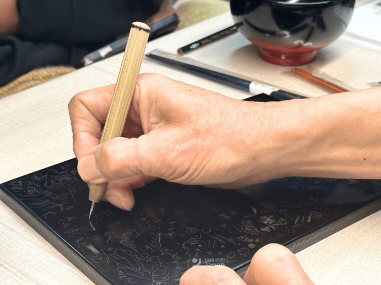 ก่อนลงมือวาดลวดลายก็จะมีอาจารย์มาสอนวิธีการใช้แท่งขูดลายกันก่อน โดยเราสามารถฝึกมือกับแท่นสีดำนี้ก่อน ชินมือแล้วก็เริ่มวาดลวดลายลงบนจานได้เลย