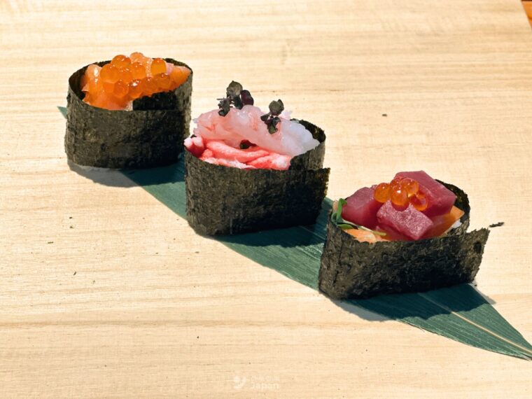 ซิกเนเจอร์ของที่นี่คือเซ็ตเมนูที่เราจะได้ลองทำโฮโซมากิซูชิ และกุนคังซูชิด้วยตัวเอง ซึ่งเราสามารถเลือกวัตถุดิบที่จะเอามาทำเป็นหน้าของซูชิ หรือไส้ในซูชิได้คนละ 5 อย่างเลย จะมีทั้งวัตถุดิบที่เป็นอาหารทะเล ไข่ ชีส แฮม หรือแม้แต่อะโวคาโด