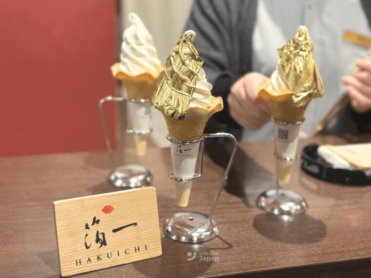 ไฮไลต์ที่ห้ามพลาดคือการกินไอศกรีมทองคำเปลวสุดหรู ที่ปิดแผ่นทองคำทั้งชิ้นแบบอลังการ ถ่ายรูปสวยและเป็นซิกเนเจอร์ของคานาซาวะ ราคาโคนละ 891 เยน