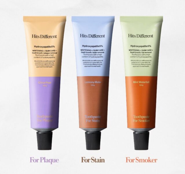 Hits Different เป็นแบรนด์ดูแลช่องปากที่มุ่งเน้นการเปลี่ยนกิจวัตรการแปรงฟันให้ดูทันสมัยและมีความสุข แบรนด์แบ่งสินค้าตามการใช้งานและปัญหาที่ต้องการแก้ไข สูตร For Plaque (แถบสีฟ้า) เน้นการขจัดคราบพลัค (ขี้ฟัน) สูตร For Stain (แถบสีส้ม) สำหรับผู้ที่ดื่มชา กาแฟ หรือไวน์ และกังวลเรื่องคราบสีติดฟัน สูตร For Smoker (แถบสีเทา/ดำ) สำหรับผู้ที่สูบบุหรี่และต้องการขจัดคราบยางบุหรี่โดยเฉพาะ เน้นให้ฟันขาวสะอาดและเงางามด้วยส่วนผสมของ Apatite (Hydroxyapatite) ซึ่งเป็นองค์ประกอบหลักของเคลือบฟันถึง 96% ช่วยดูแลเหงือกให้มีสุขภาพดีและชุ่มชื้น ช่วยจัดการสภาพแวดล้อมในช่องปากเพื่อยับยั้งและป้องกันกลิ่นปาก ให้ลมหายใจสดชื่น