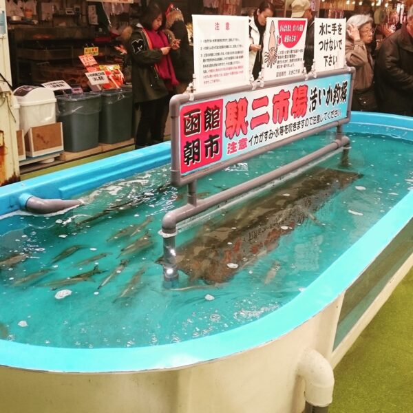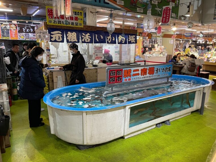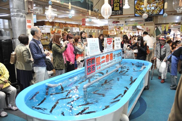 ถ้ามีคนบอกว่าตลาดเช้าฮาโกดาเตะสามารถ “ตกปลาหมึกแล้วกินได้ทันที” หลายคนอาจคิดว่าเป็นเรื่องล้อเล่น แต่ที่ Ekini Ichiba สิ่งนี้เกิดขึ้นจริง ที่นี่มี Live Squid Fishing Pond หรือบ่อตกปลาหมึกสด นักท่องเที่ยวสามารถจ่ายเงินเพื่อรับเบ็ด จากนั้นลองตกปลาหมึกที่กำลังว่ายอยู่ในบ่อ เมื่อจับได้แล้ว พนักงานจะนำปลาหมึกไปทำเป็น ซาชิมิสดทันที
