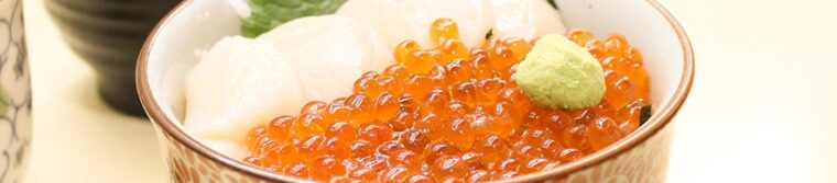 Kaisendon พื้นฐาน มักประกอบด้วยแซลมอน อิคุระ หอยเชลล์ และทูน่า