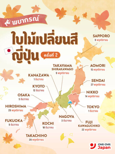 ญี่ปุ่นช่วงใบเปลี่ยนสีเป็นอีกช่วงเวลาที่น่าเที่ยวที่สุด เพราะได้ชมบรรยากาศที่สวยงามของใบไม้ที่เปลี่ยนสีสันไปพร้อม ๆ กับทิวทัศน์อันงดงามของธรรมชาติ ทาง ChillChillJapan จึงไม่พลาดที่จะเอาพยากรณ์ใบไม้เปลี่ยนสีของญี่ปุ่น มาให้ดูกันล่วงนี้ เพื่อน ๆ จะได้จองตั๋วมาเที่ยวญี่ปุ่นหรือแพลนเที่ยวญี่ปุ่นได้ตรงกับช่วงเวลาใบไม้เปลี่ยนสีของญี่ปุ่นนั่นเอง