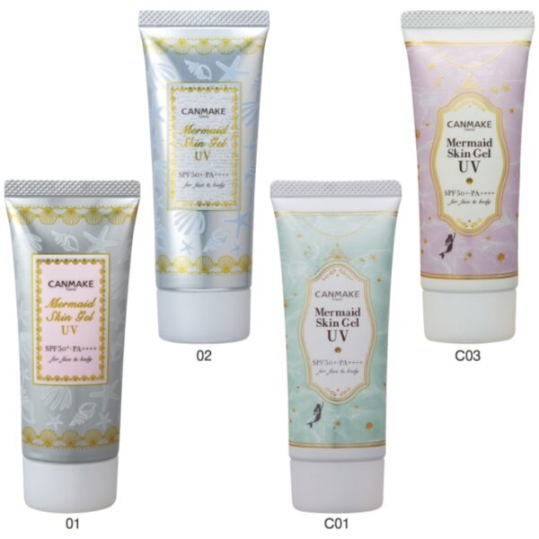 รุ่นแนะนำ: Canmake Mermaid Skin Gel UV SPF 50+ PA++++ เนื้อเจลซึมไว เจลสามารถแตกตัวเป็นน้ำได้ทำให้เบาผิวเวลาทา ผิวเนียนเรียบ เป็นฐานที่ดีสำหรับแต่งหน้า มี Hyaluronic Acid 9 ชนิด