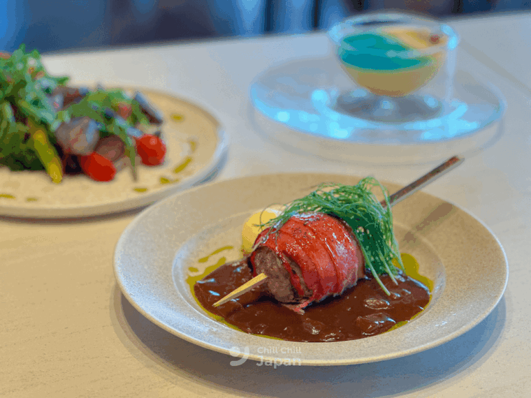 อย่างเมนูนี้ก็คือ JUNGLIA Hamburg Steak (3,200 เยน)แฮมเบิร์กชุ่มฉ่ำ อร่อยทุกคำที่กัด และยังมีสลัด โอเอซิสเพลท เมนูสำหรับสายวีแกนที่ทั้งอร่อยและอิ่มท้อง