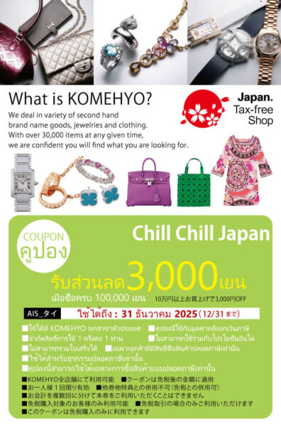 นอกจากราคาจะคุ้มค่า สินค้าหลากหลายแล้ว Komehyo ยังมีคูปองส่วนลดมาแจกให้อีก สำหรับใครที่มีแพลนจะไปซื้อสินค้าแบรนด์เนมมีสองสวย ๆ คุณภาพดีที่นู้น แค่ช้อปครบมูลค่าที่กำหนดแล้วโชว์รูปคูปองจากหน้าจอเครื่อง ก็ลดราคากันไปเลยจ้า!