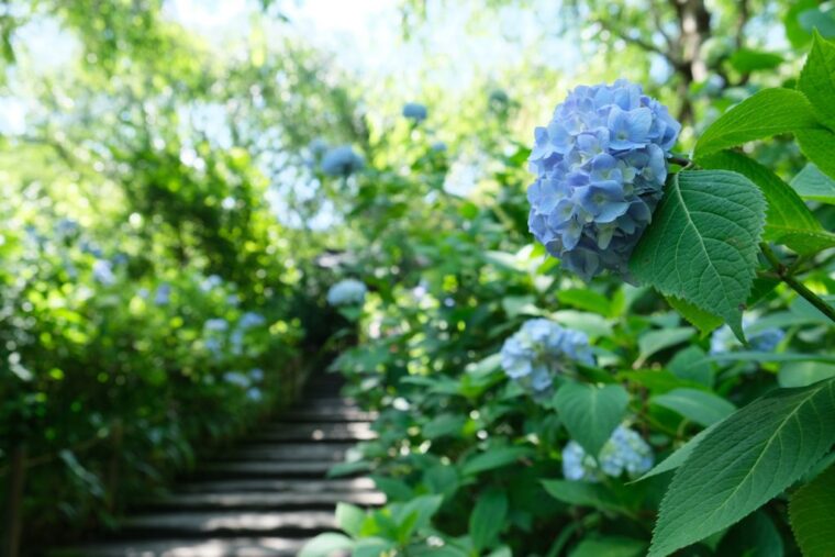 ดอกไฮเดรนเยีย Meigetsuin Blue ที่มีประมาณ 2,500 – 3,000 ต้น