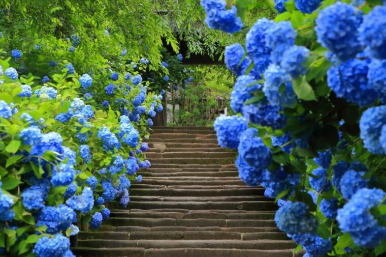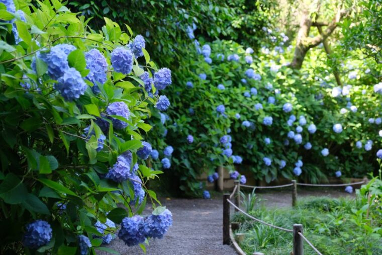 เดือนมิถุนายนเป็นช่วงเวลายอดนิยมที่สุดสำหรับการเยี่ยมชมวัดเมเงทสุอิน โดยช่วงที่ดอกไฮเดรนเยียบานสะพรั่งที่สุดคือกลางเดือนมิถุนายน ดอกไฮเดรนเยีย Meigetsuin Blue กว่า 2,500 ต้นจะสร้างทะเลสีฟ้าที่สวยงามไปทั่วบริเวณวัด