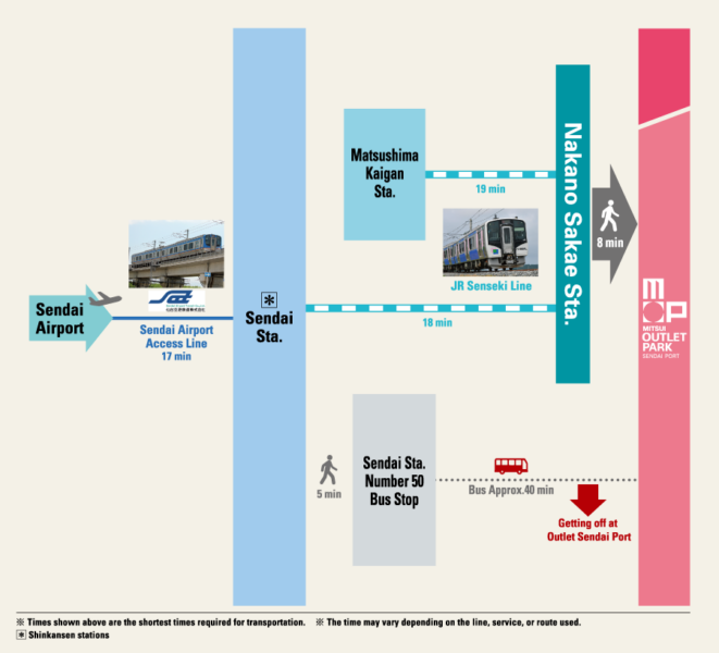 MITSUI OUTLET PARK SENDAI PORT เดินทางจากตัวเมืองเซนไดได้ง่ายและเข้าใจไม่ยาก แม้จะเป็นครั้งแรกที่มาเที่ยวก็ไม่ต้องกังวล เพราะสามารถเดินทางได้ทั้งรถไฟ เดินเท้า และรถบัส จึงเลือกวิธีที่เหมาะกับตารางทริปและปริมาณสัมภาระได้ตามต้องการ ด้านล่างคือวิธีเดินทางที่แนะนำสำหรับนักท่องเที่ยวแบบเข้าใจง่าย