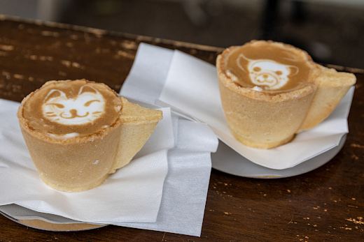 Cookie Cup Espresso (ร้าน Koma) – กาแฟเอสเปรสโซ่เสิร์ฟในถ้วยที่ทำจากบิสกิต กินกาแฟเสร็จแล้วกินถ้วยต่อได้เลย เป็นเมนูเช็คอินชื่อดังในโซเชียลที่ต้นตำรับมาจากร้าน Koma ในตลาดนี้โดยเฉพาะ ถ้าตามหาให้สังเกตป้ายร้านและคิวนักท่องเที่ยวที่มักยาวกว่าร้านอื่น