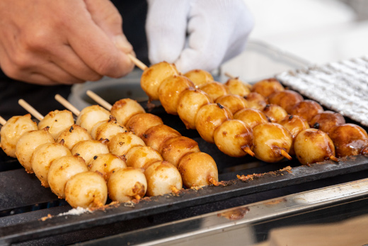 Mitarashi Dango – ลูกโมจิเสียบไม้ราด ซอสโชยุ ย่างไฟจนผิวเป็นสีน้ำตาลเคลือบมันวาว รสหอมเค็มซีอิ๊วเล็กน้อย หาทานได้ง่ายตามแผงริมแม่น้ำ
