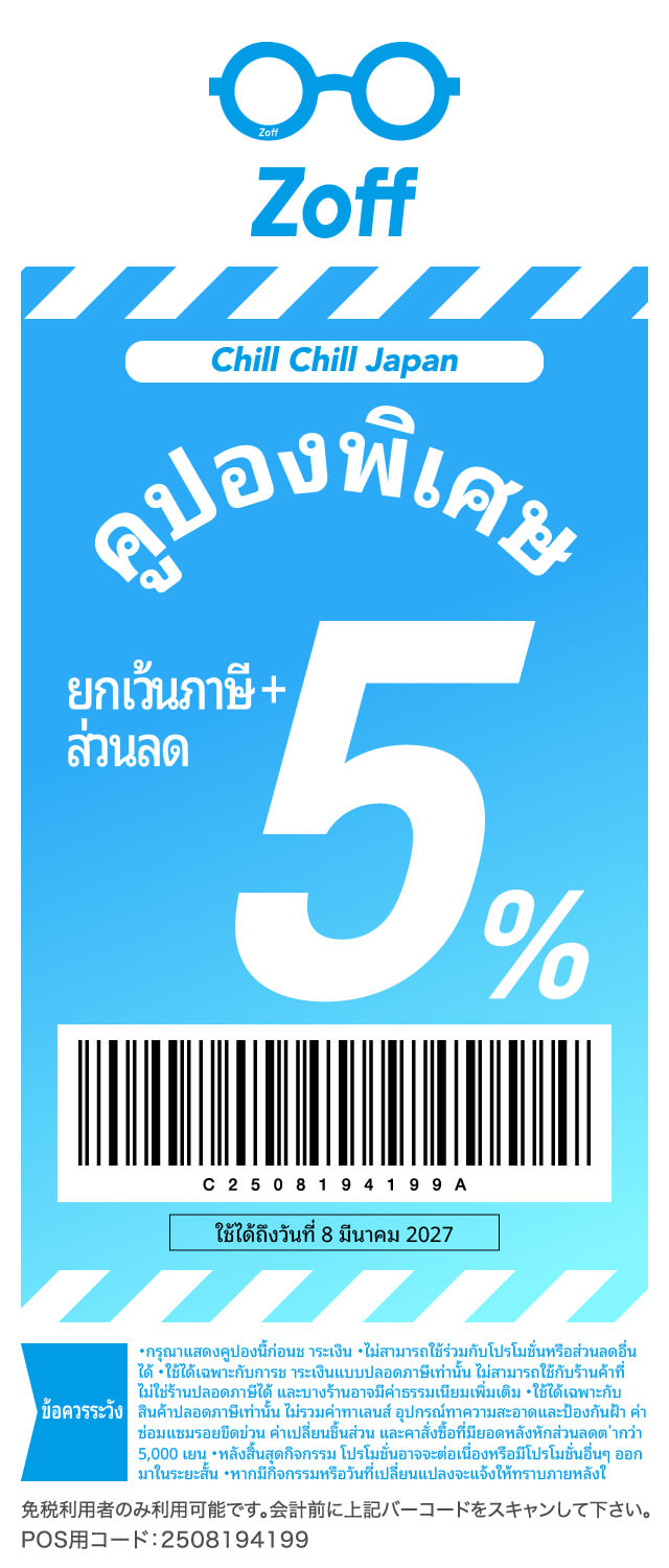 | เงื่อนไขในการใช้งาน | กรุณาแสดงคูปองนี้ก่อนการชำระเงิน ไม่สามารถใช้ร่วมกับคูปองอื่นๆได้ ไม่สามารถใช้คูปองนี้ได้ในบางสาขา สามารถใช้เป็นส่วนลดได้ในกรณีที่ซื้อสินค้าแบบปลอดภาษีเท่านั้น ใช้เป็นส่วนลด 5% จากยอดซื้อทั้งหมด น้ำยาทำความสะอาด น้ำยากันฝ้า ค่าบริการเปลี่ยนเลนส์ ค่ารับประกันรอยขีดข่วน ค่าเปลี่ยนอะไหล่ รวมไปถึงยอดชำระที่ต่ำกว่า 5,000 เยน หลังจากหักส่วนลด 5% ไม่อยู่ในเงื่อนไขการใช้คูปอง อาจมีค่าธรรมเนียมอื่นๆ เพิ่มเติมในบางสาขา |