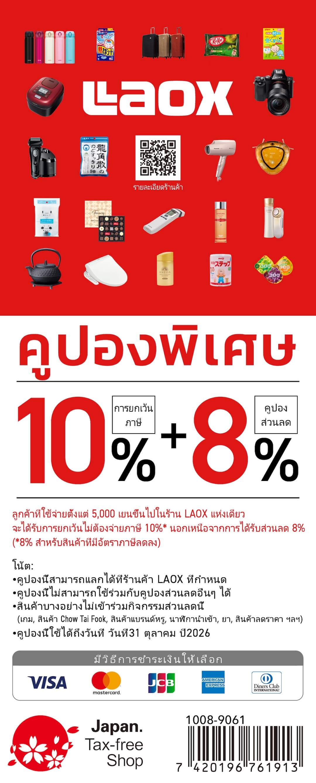 | เงื่อนไขในการใช้งาน | ・คูปองนี้สามารถแลกได้ที่ร้าน LAOX ที่กำหนด · คูปองนี้ไม่สามารถใช้ร่วมกับส่วนลดอื่น ๆ ได้ ・มีสินค้าบางรายการไม่เข้าร่วม (เกม, สินค้า Chow Tai Fook, สินค้าแบรนด์หรู, นาฬิกานำเข้า, ยา, สินค้าลดราคา อื่นๆ) |