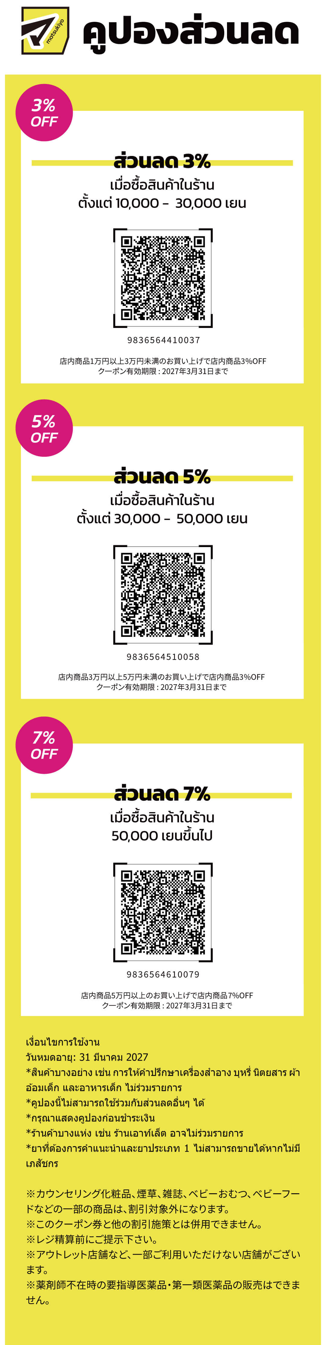| อื่น ๆ | สินค้าที่มีคำว่า 割引對象外 (ส่วนลดไม่สามารถใช้ได้) อยู่บริเวณป้ายราคาจะไม่สามารถใช้คูปองลดราคาได้ |