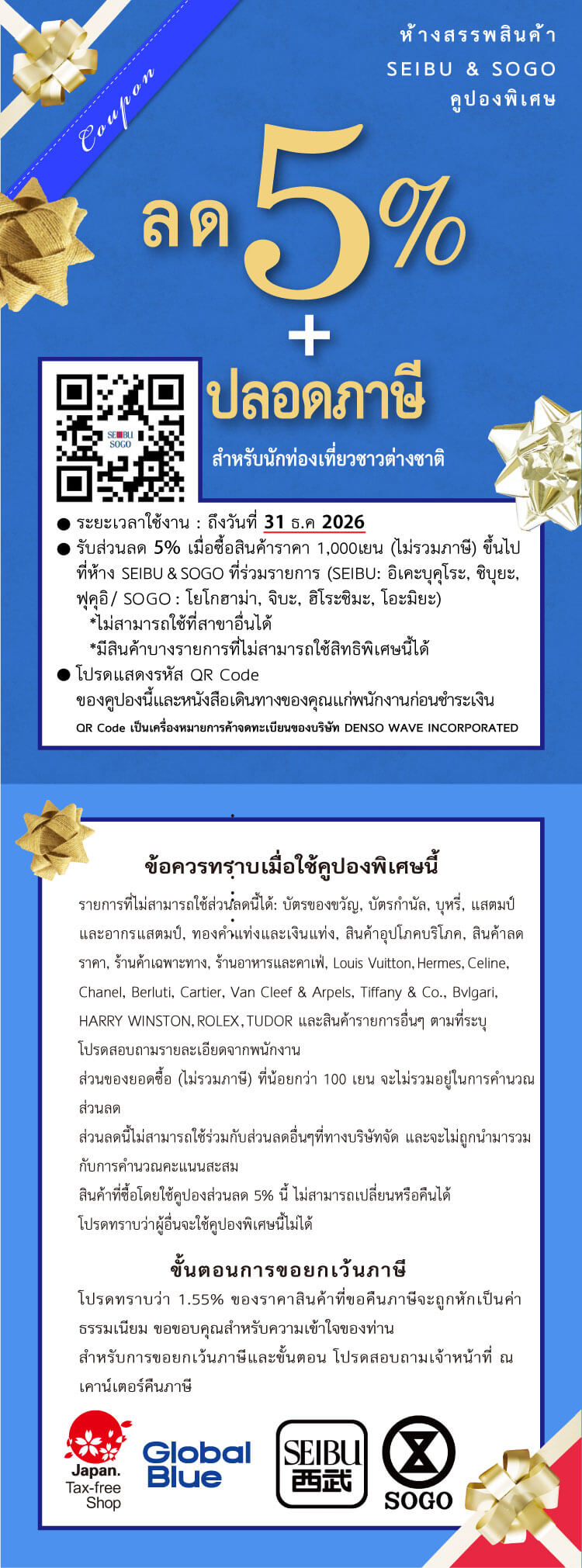 | เงื่อนไขในการใช้งาน | *รับส่วนลด 5% จากราคาที่ยังไม่รวมภาษีที่แสดงไว้ในร้าน *ไม่สามารถใช้คูปองนี้ร่วมกับคูปองอื่นได้ *กรุณาแสดงบาร์โค้ดคูปองก่อนทำการชำระเงิน หากแสดงหลังจากการชำระเงินจะไม่สามารถใช้ส่วนลดได้ *สามารถใช้คูปองนี้ได้เพียง 1 ครั้ง *ไม่สามารถใช้คูปองนี้ได้กับร้านที่ไม่ได้เข้าร่วมรายการ *สามารถใช้คูปองนี้ได้เมื่อซื้อสินค้าแบบปลอดภาษีเท่านั้น |