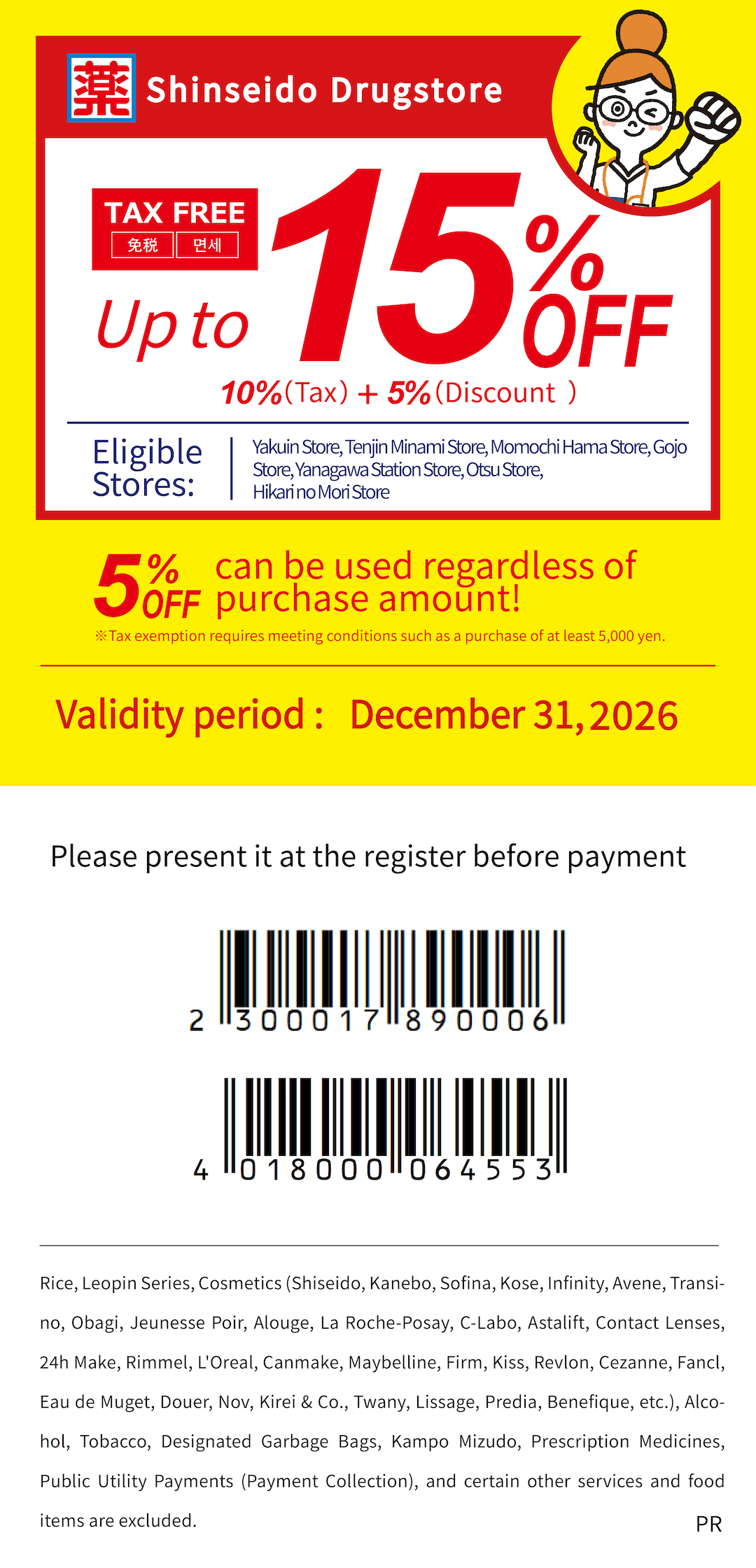 ชินเซโด (Shinseido) เป็นเครือร้านขายยาที่มีสาขากระจายอยู่ทั่วภูมิภาคคิวชูเป็นหลัก เรามีสินค้าหลากหลายตั้งแต่ของใช้ในชีวิตประจำวันไปจนถึงยารักษาโรค เพื่อช่วยให้คุณได้ช้อปปิ้งในราคาสุดคุ้ม บทความนี้จะแนะนำคูปองส่วนลดพิเศษอย่างละเอียด เป็นส่วนลดที่ใช้ได้โดยไม่จำกัดยอดซื้อขั้นต่ำ และไม่จำเป็นต้องทำเรื่องขอคืนภาษี ทำให้ช้อปปิ้งได้สะดวกสบายแม้ซื้อสินค้าราคาไม่สูง