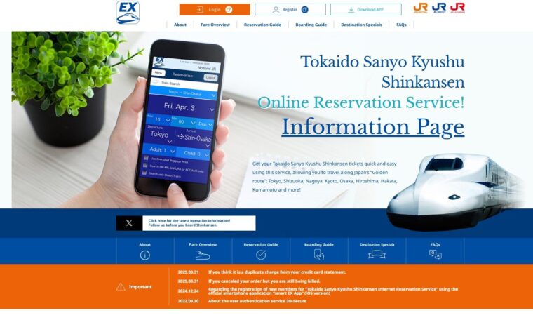 2.SmartEX (JR Central Online Reservation) คือบริการจองตั๋วชินคันเซ็นออนไลน์อย่างเป็นทางการของ JR Central, JR West และ JR Kyushu (ใช้กับเส้น Tokaido‑Sanyo‑Kyushu Shinkansen) ซึ่งมีระบบราคาพิเศษเมื่อจองล่วงหน้าเรียกว่า Hayatoku ซึ่งมีเงื่อนไขสำคัญเลยคือสามารถจองล่วงหน้า 7 วัน 21 วัน หรือ 28 วันได้ (ขึ้นอยู่กับประเภท) ใช้ได้กับบางขบวน และบางช่วงเวลาเท่านั้น บางโปรไม่สามารถยกเลิกหรือเปลี่ยนแปลงได้