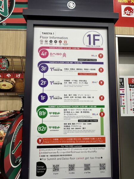 จำหน่ายสินค้าหลากหลายมาก ๆ ใครตามหาขนมของฝากมาช้อปได้ทีเดียวที่นี่ โดยชั้น 1-3 จะเป็นชั้นจำหน่ายสินค้าของทาเคยะ ส่วนชั้น B1-B2 เป็นซุปเปอร์มาร์เก็ต และชั้น 4 จะเป็นโซนของ DAISO หรือร้าน 100 เยนนั่นเองค่ะ
