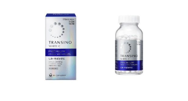 ทรานซิโน ไวท์ ซี พรีเมียม (Transino White C Premium) เป็นยารักษาที่มีวิตามินซีเป็นส่วนประกอบหลัก เหมาะสำหรับผู้ที่กังวลเรื่องฝ้า กระ หรือจุดด่างดำจากแสงแดด โดยเป็นการดูแลจากภายในสู่ภายนอก ตัวยามีส่วนประกอบของวิตามินซีและแอล-ซิสเทอีน (L-Cysteine) ที่ช่วยยับยั้งการสร้างเม็ดสีเมลานิน พร้อมสนับสนุนการผลัดเซลล์ผิวเพื่อบรรเทาอาการฝ้า กระ และรอยดำจากแสงแดด นอกจากนี้ยังมีวิตามินเสริมอีก 5 ชนิด (อี, บี 2, บี 6, ไนอะซิน และแคลเซียม แพนโททีเนต) ซึ่งช่วยให้การดูแลผิวจากภายในเป็นเรื่องง่าย