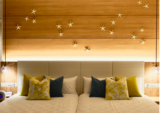 ตัวห้องตบแต่งด้วยโทนสีฟ้าน้ำทะเล สีเหลืองประหนึ่งอยู่ท่ามกลางดวงดาวและพระจันทร์ ที่สำคัญค่ำคืนดีๆแบบนี้ ทางโรงแรมก็จัดเตรียมไวน์ และแชมเปญให้ดื่มภายในห้อง แบบไม่ต้องสั่งกันเลย