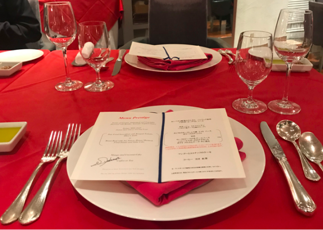 พอเรามาถึงห้องอาหาร พนักงานจะเสิร์ฟแชมเปญให้เราเชียร์ก่อนเลย เมนูอาหารวันนี้มี อาหารจานหลักเป็นปลาคาจิกิ ซอสมะเขือเทศ หรือจะเป็นสเต็กเนื้อวัวราดด้วยซอสหางวัวค่ะ