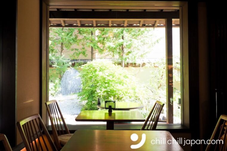 ด้านในของร้านก็มีโต๊ะให้เราได้เลือกนั่งในวันที่อากาศร้อนๆ มีกระจกบานใหญ่ให้เราได้ชมบรรยากาศสวนด้านนอก ที่นี่สวยทุกฤดูฟินสุดๆไปเลย