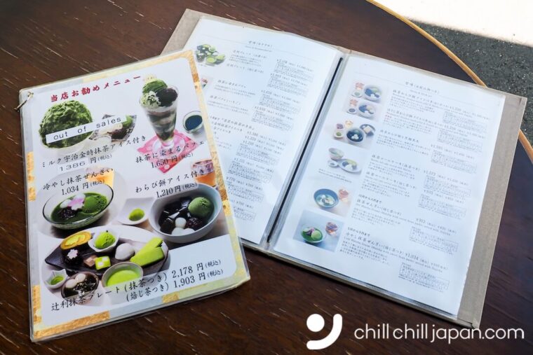 เมนูในคาเฟ่มีให้เลือกเยอะเลย มีทั้งเมนูขนมที่จัดเต็มอย่างพาเฟ่ต์หรือเซ็ตขนมรวมหลากหลาย ไปจนถึงเซ็ตเมนูง่าย ๆ ที่ประกอบด้วยชาและขนมรับประทานคู่กับชา ใครมากันหลายคนก็สามารถสั่งมาแชร์กันได้ เมนูยอดฮิตของที่นี่คือ วาราบีโมจิ กับไอศรีมพาเฟ่ต์มัทฉะ และยังมีเมนูตามฤดูกาลที่จะเปลี่ยนไปเรื่อย ๆ ด้วย