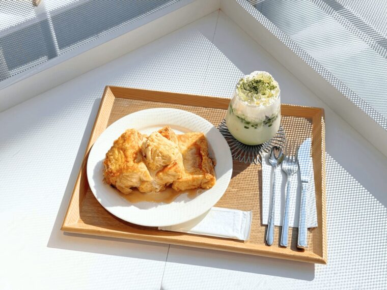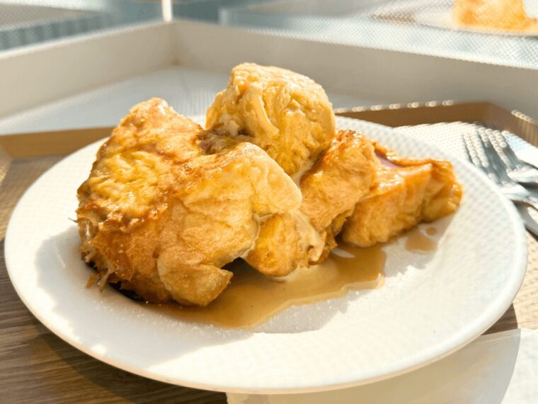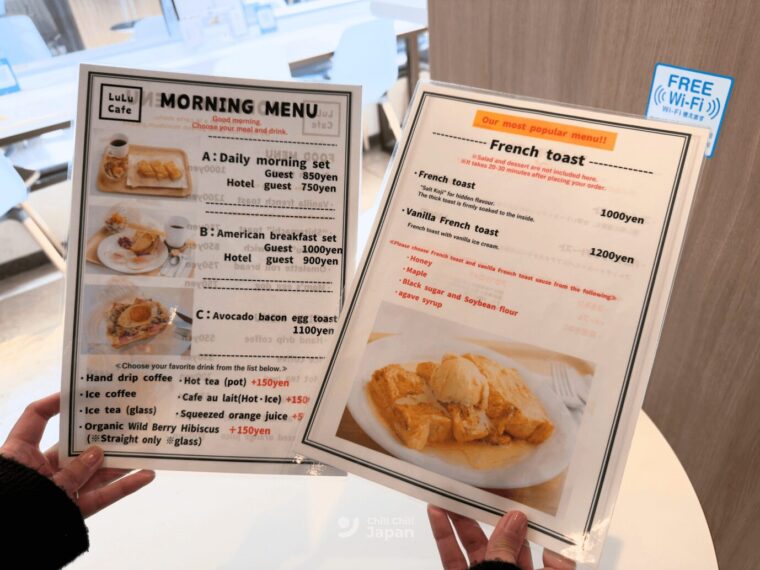 ซึ่งเมนูเด็ดของที่นี่ก็คือเฟรซน์โทสชิ้นโตทำสดใหม่ และซอสราดที่สามารถเลือกได้ 1 อย่าง ไม่ว่าจะเป็นน้ำผึ้ง เมเปิ้ลไซรัป น้ำเชื่อมคุโรมิสึ + คินาโกะ ในราคา 1,000 เยน ใครจะเพิ่มท็อปปิ้งไอศกรีม +200 เยน บอกเลยอร่อยฟินสำหรับคนที่อยากกินของอร่อยแต่เช้าแน่นอน