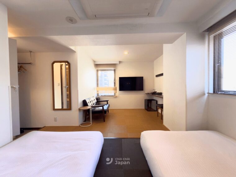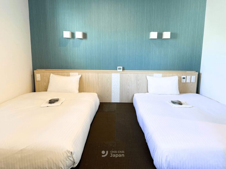 ใครไม่ถนัดนอนฟูกแบบญี่ปุ่น ทางโรงแรมเขาก็มีห้องพักที่เป็นเตียงแต่ดีไซน์ออกมาผสมผสานกับความเป็นญี่ปุ่นอยู่ด้วยซึ่งเรียกว่า ห้อง Superior Twin แบบ Wa Modern Style