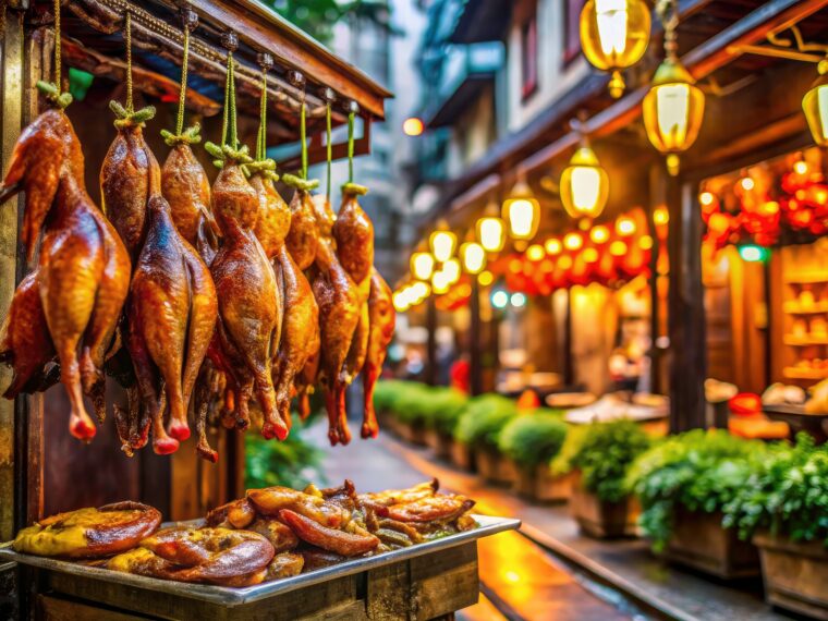 หนังกรอบ เนื้อนุ่ม ทานคู่กับแป้งบาง ๆ ซอสหวาน และผักสด รสชาติกลมกล่อมไม่มัน ร้านที่ขายเป็ดปักกิ่งแบบห่อกินมีตามถนนหลัก ราคาประมาณ 500–800 เยนต่อชิ้น ถ้าอยากนั่งกินแบบเต็มรูปแบบ มีร้านเฉพาะที่เสิร์ฟเป็ดทั้งตัวพร้อมแกะหน้าโต๊ะ ราคาประมาณ 8,000–15,000 เยนต่อตัว เหมาะสำหรับกลุ่มใหญ่